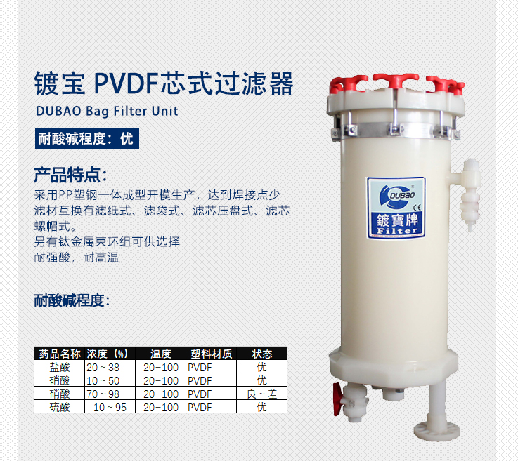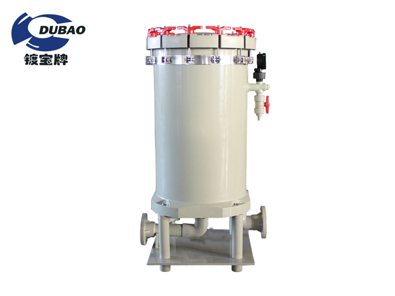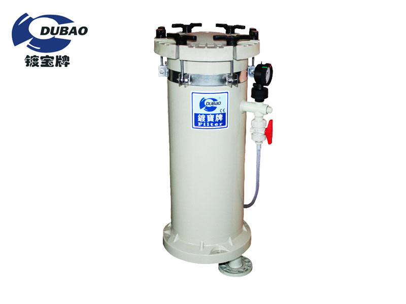 鍍寶耐腐蝕濾芯式保安過濾器:  產(chǎn)品特點(diǎn):  1.過濾機(jī)主體及各種重要零件,均采用PP塑鋼材質(zhì)一體成型開模生產(chǎn),達(dá)到焊接點(diǎn)最少、防漏液性最佳。  2.濾芯互換有濾紙式、濾袋式、濾芯壓盤式、濾芯螺帽