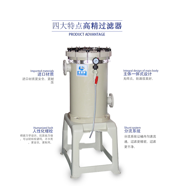 高壓過濾器:   產(chǎn)品特點(diǎn):   1、本過濾器上下主體均采用特厚PP板制作而成,濾桶可選用PP、PVC及亞克力制作,具有耐高壓、耐腐蝕之特性。   2、扣環(huán)及螺絲可選用工業(yè)純鈦及SUS316材質(zhì)制