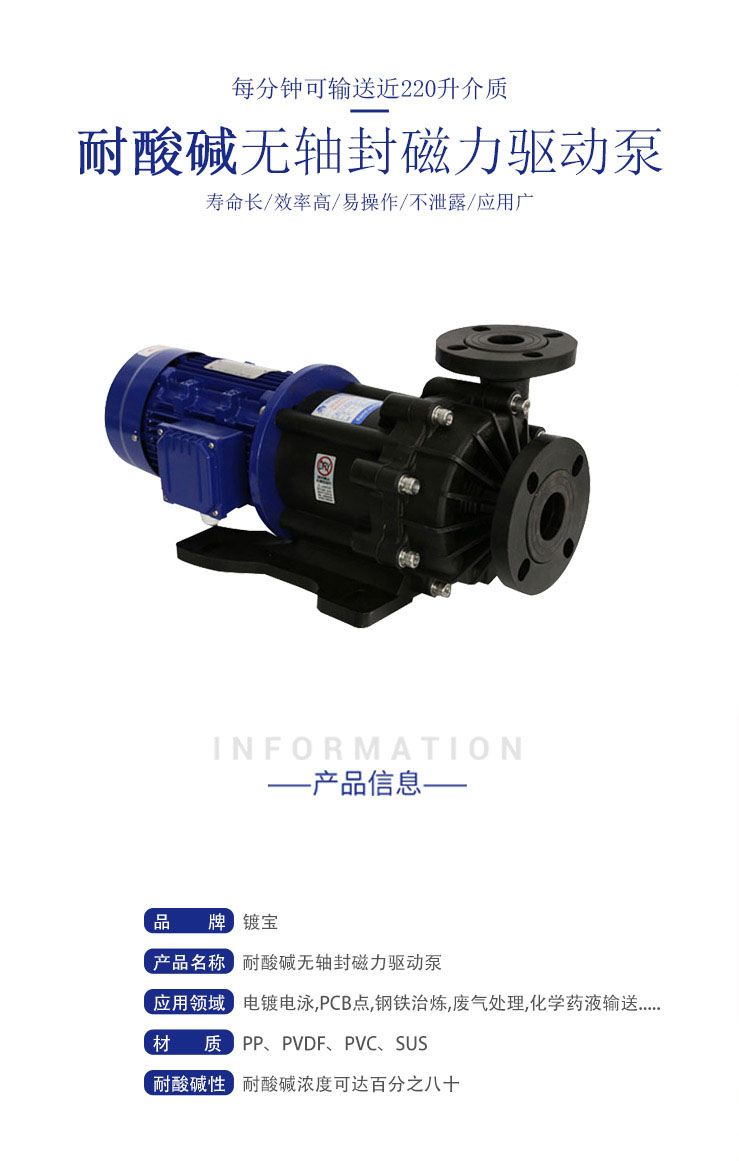 MDH的泵殼,葉輪和磁囊以聚丙烯塑料制成, MDH- P的這些部件采用氟塑料、其他接觸液體的部件由高耐腐蝕材料,如碳、陶瓷等制成,可輸送各類型的酸堿化學(xué)液體。