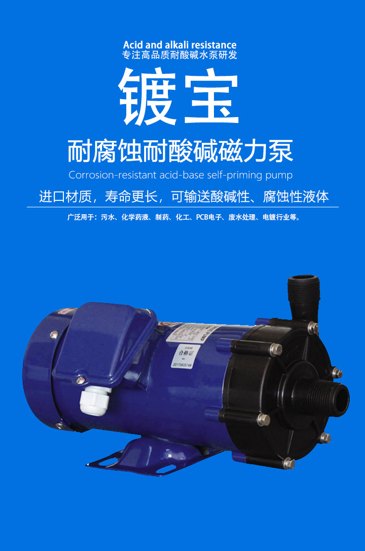 MD耐腐蝕磁力泵 功能特點(diǎn): MD系列磁力泵結(jié)構(gòu)小巧防漏 在各個(gè)行業(yè)廣泛應(yīng)用以其耐腐蝕性和耐用性而擁有廣大用戶的贊譽(yù)。主要材質(zhì)使用FRPP、PVDF ETFE 可以用來(lái)輸送多種腐蝕性的液體